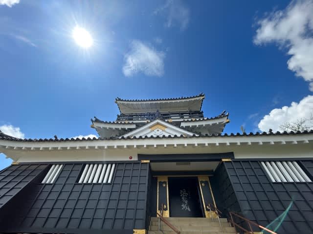 黒×白×金の天守閣と青空のコントラストが映えます。
