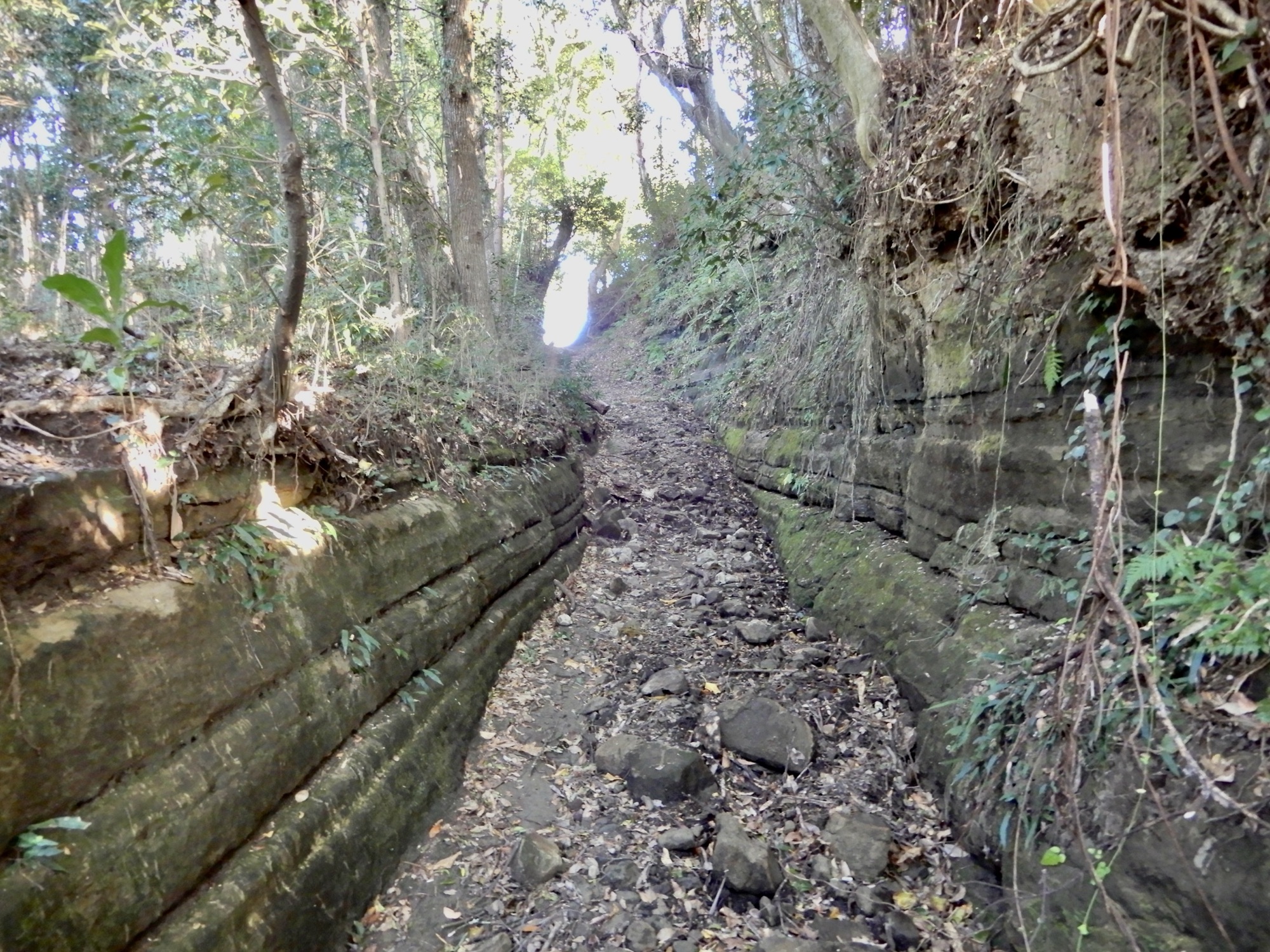 森に入ると岩盤の切通しになっています。