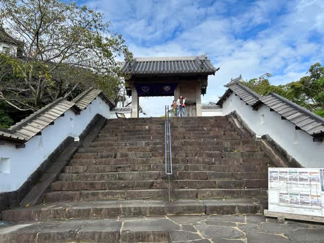 城に向かう登り階段と塀、そして天守閣が一同に映るこのスポットは綺麗です。