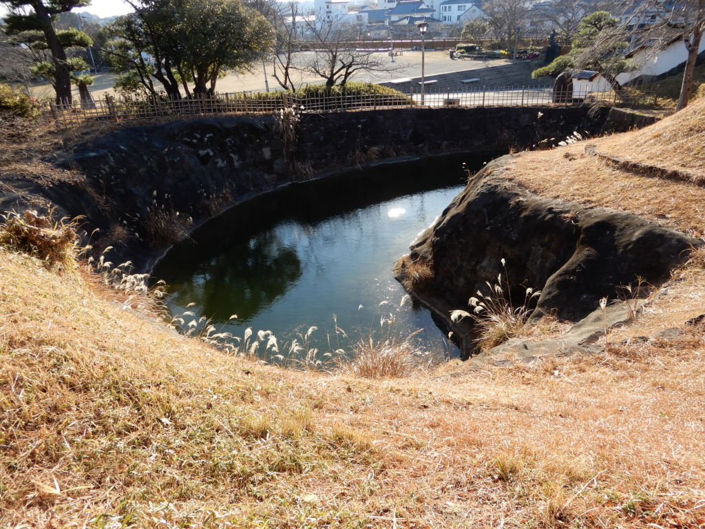 明治期に埋め立てられましたが、発掘調査によって復元されました。しかし、本来の1/3程度の範囲で復元されたので、実際は本丸を守る大きな堀だったと思われます。