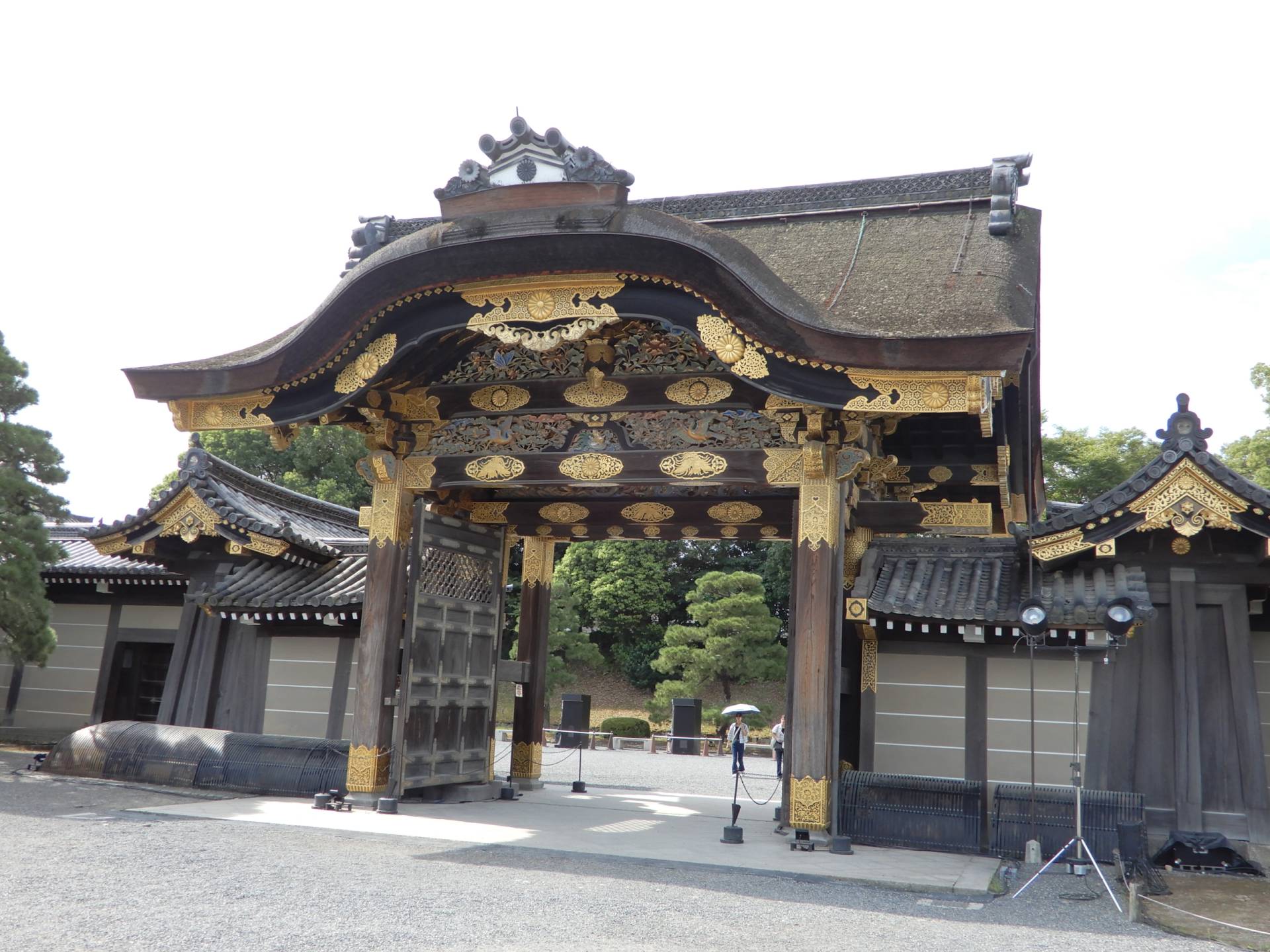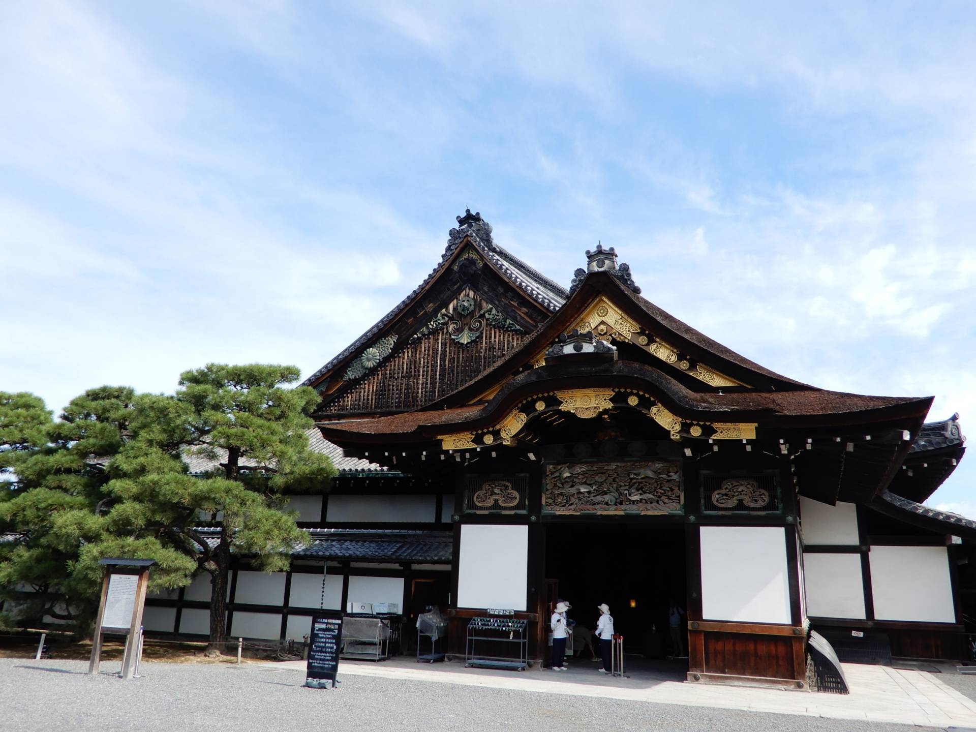 元離宮二条城並び二の丸の代表的建造物である国宝・二の丸御殿6棟(付属:重要文化財2棟)は、東大手門(重要文化財)から入城し突き当たりの筋塀(重要文化財)を南端まで歩き左折すると長く連なる筋塀と御殿正門である威風堂々で豪奢な唐門(重要文化財)に囲まれている二の丸御殿正門正面に対面する。