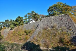 蒲生氏郷が夜を日に継いでわずか3年で完成させた城。豪壮な石垣が残っており、往時の城の姿を現代に伝えている。
