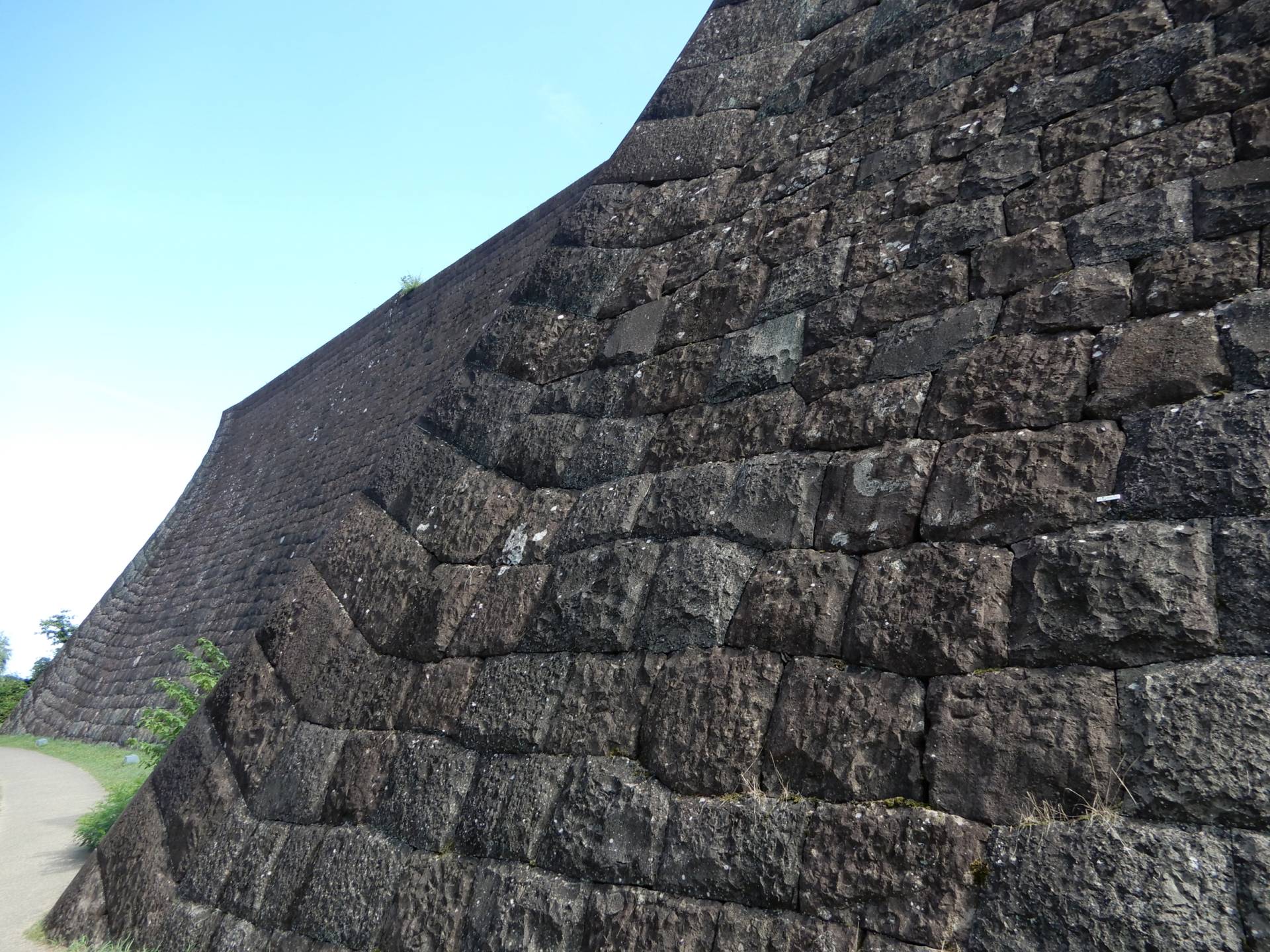 本丸北壁石垣は高さ17mの大迫力。隙間なく積まれた切込接の石垣は必見。