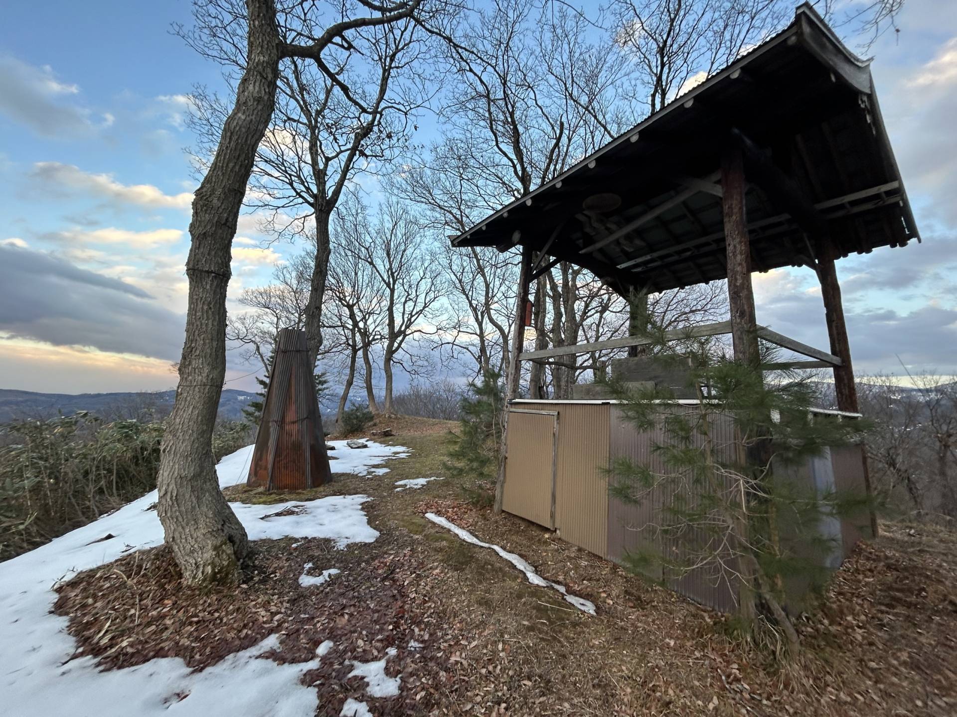 山頂には細長い曲輪が段々になって展開されており、東屋と狼煙台のレプリカ、石碑が建てられています。