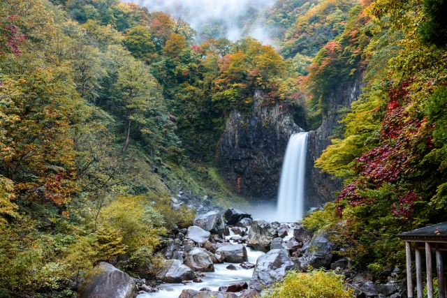 約3万年前、黒姫山の噴火によって流れ出た安山岩の溶岩が関川(せきがわ)を堰き止め、現在の新潟県と長野県の県境に小さな湖ができ上がりました。その後、水が溜まっていき天然のダムと化した湖の西端の水位が最高潮に達した結果、この苗名滝が生まれました。
