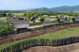 吉野ヶ里遺跡は弥生時代の環濠集落で、国内最大規模の遺跡である。物見櫓や二重の環濠など防御的な性格が強く、日本の城郭のはじまりともいえるもので、日本100名城に選ばれている。