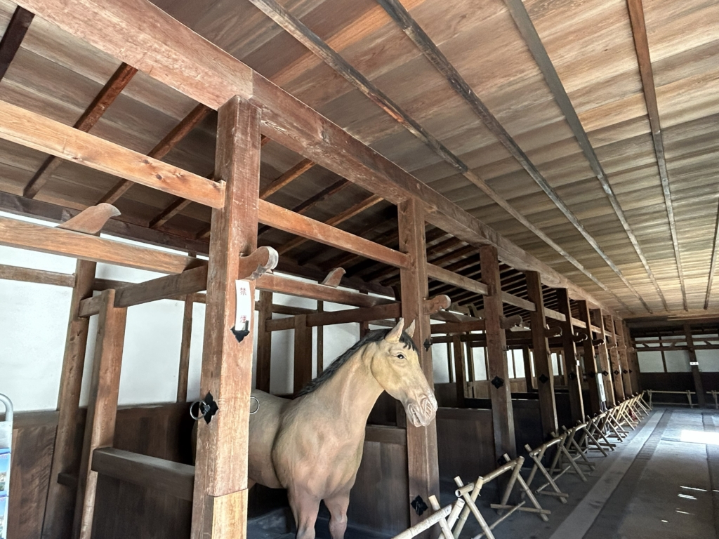 馬屋の建物はL字形をしており、佐和口の櫓門に接する東端に畳敷の小部屋、反対の西端近くに門があるほかは、すべて馬立場(うまたちば)と馬繋場(うまつなぎば)となっています。その数は21。つまり21頭もの馬を収容することができたのです。馬屋は、さらに現在の売店方向に伸びていたようですが、現在は復元されていません。