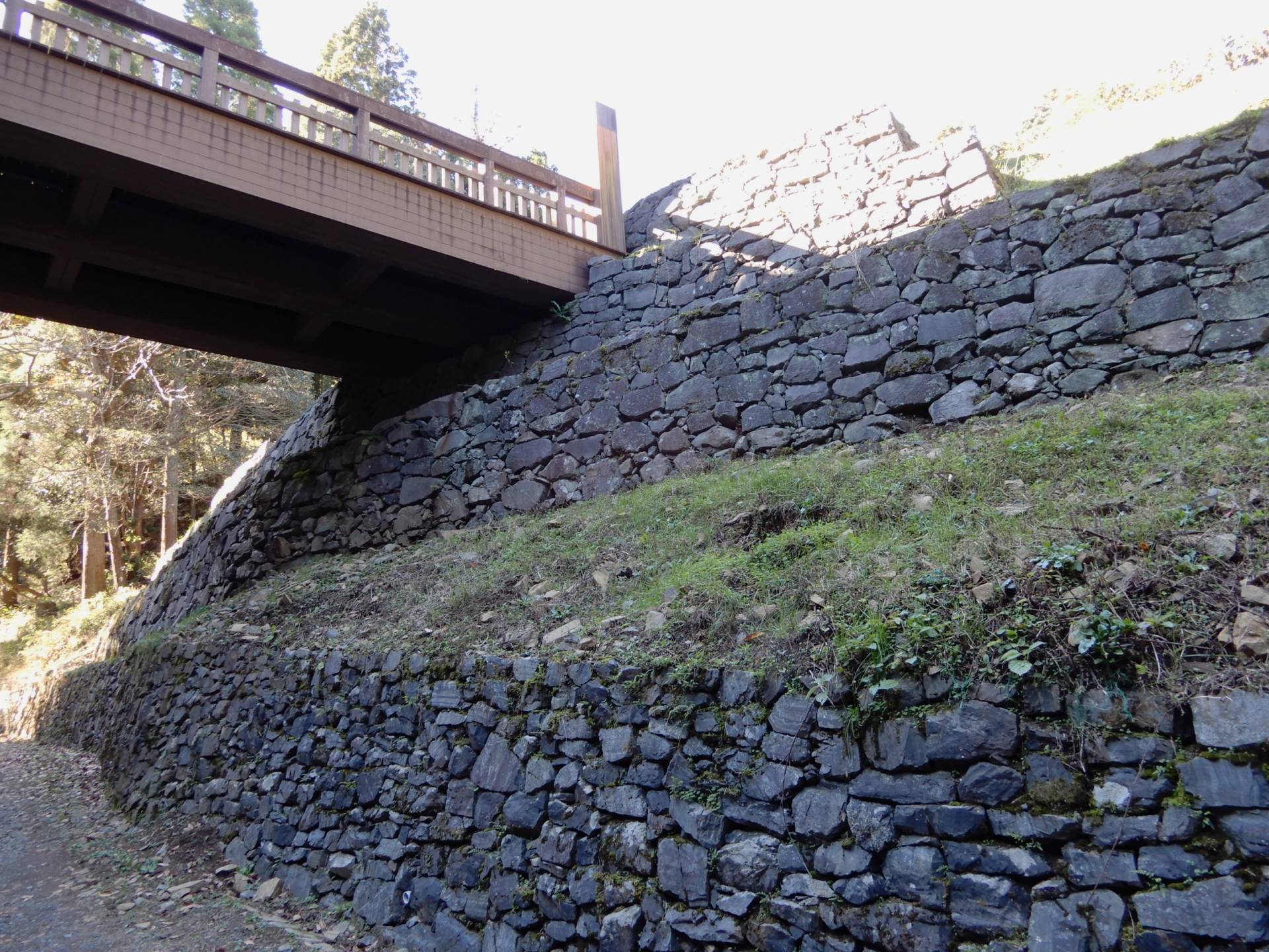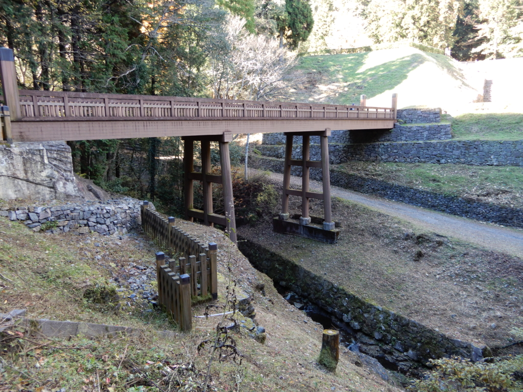 御主殿側の橋台の位置は築城当時より5mほど東側にずれており、このため段差が生じて石段が設けられている。橋台の西側の石垣は、林道整備のために削られ、移築されている。