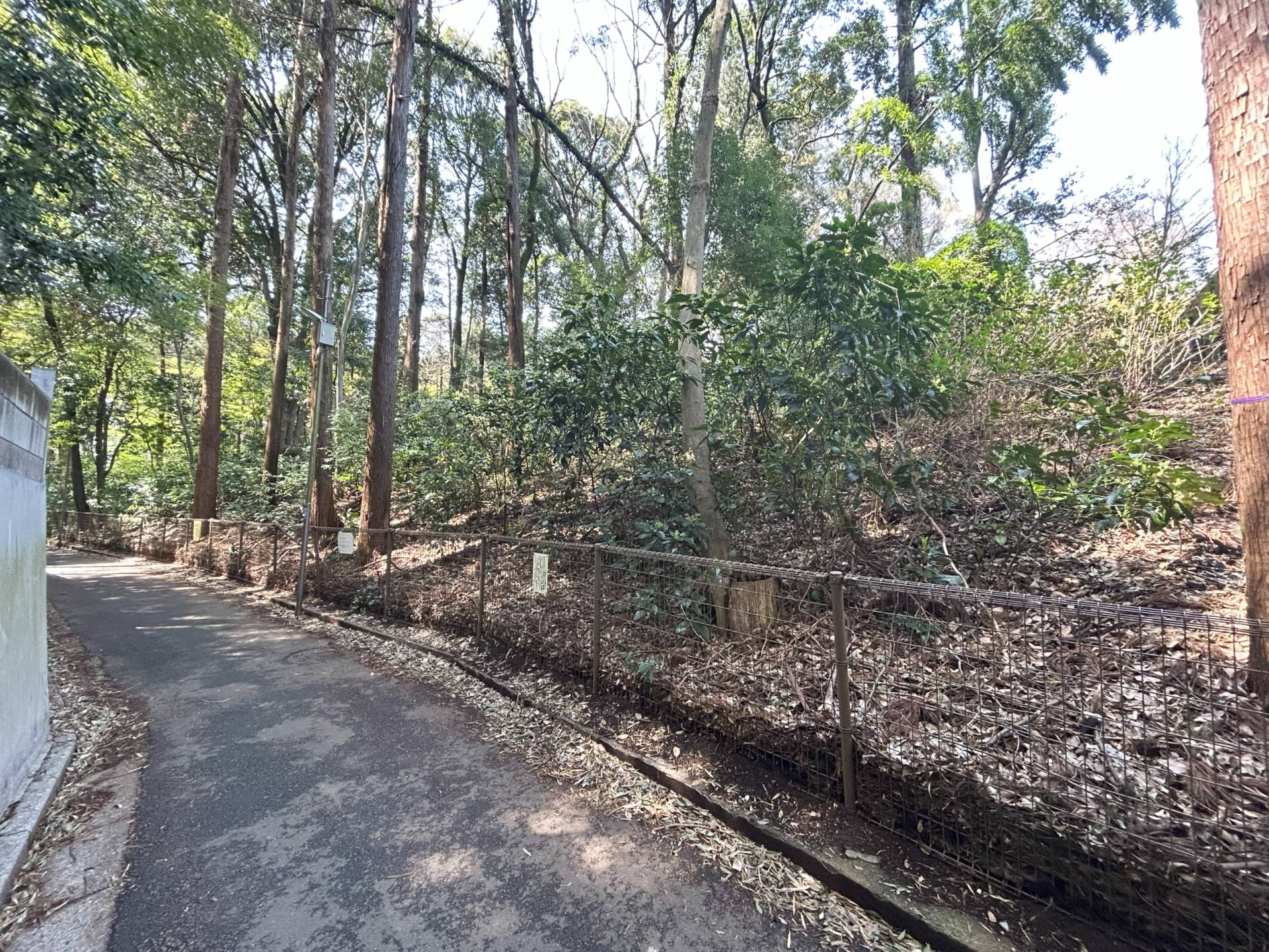 ■現在でも残っている空堀跡。公園脇の細い道から見る土塁は高く当時の姿を見ることができる。