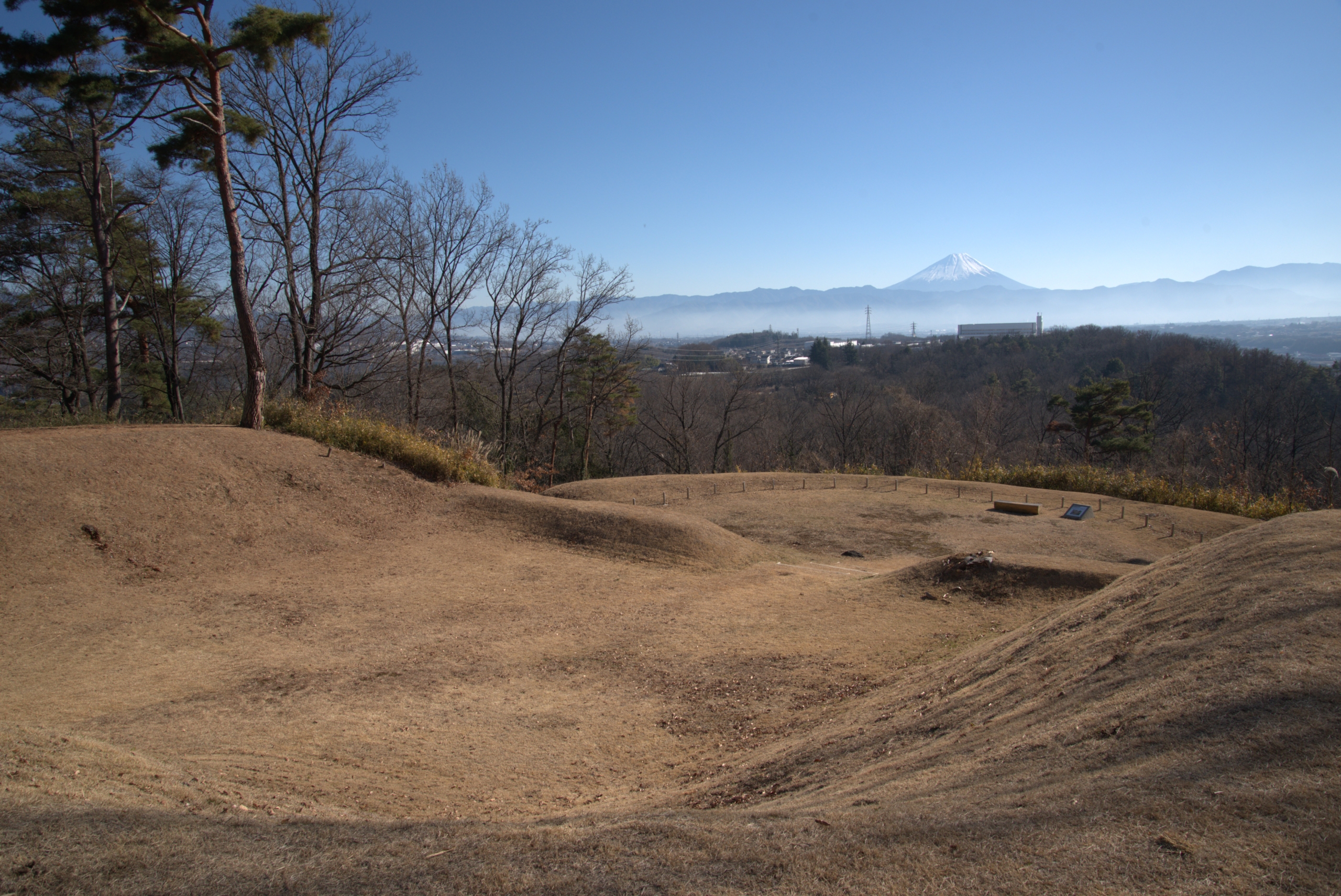 発掘調査を元に整備され、高さ3.4mの土塁が待ち受けます。奥には富士山が綺麗に見えます。気温差があったからでしょうか。街並みには靄がかかっており、より幻想的な姿でした。