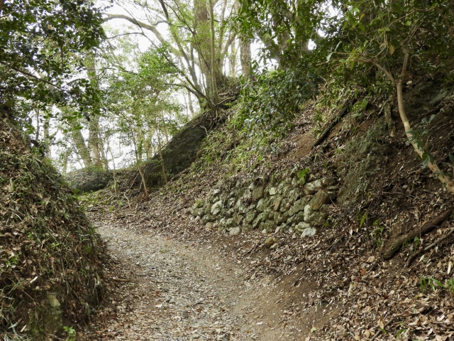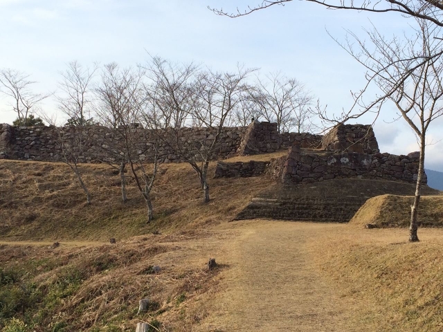 遺構:石垣、大手枡形、土塁、縦堀、堀切、土橋、復元井戸